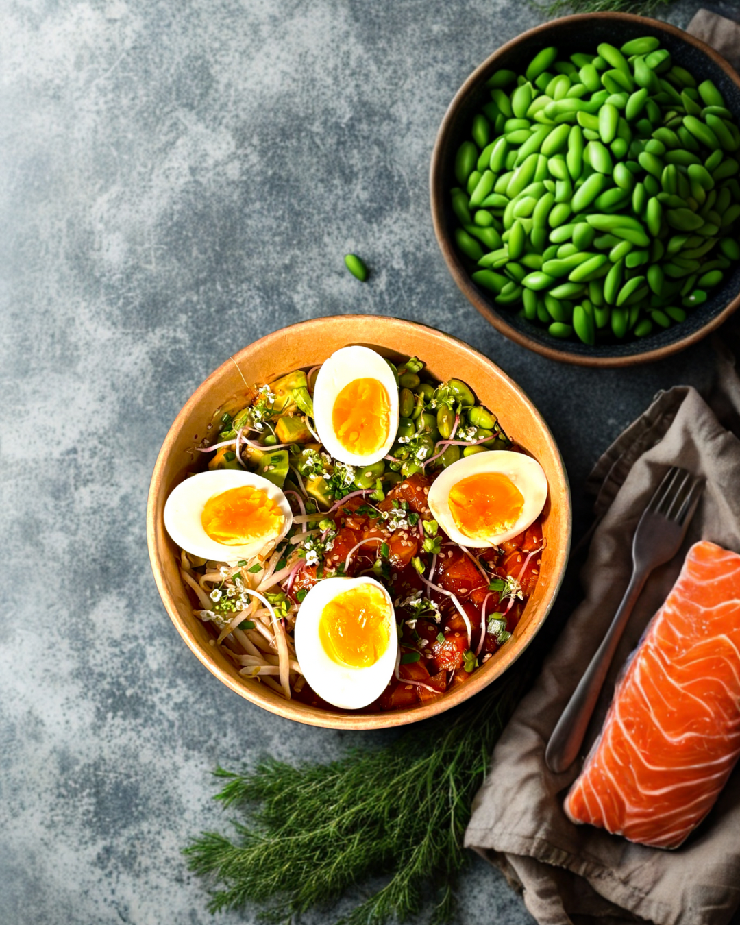 Saumon, concombre, quinoa, avocat, œufs, édamame
